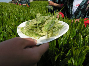 | 僕たちの真ん中で一人お茶葉を天ぷらにしているお姉さん! |